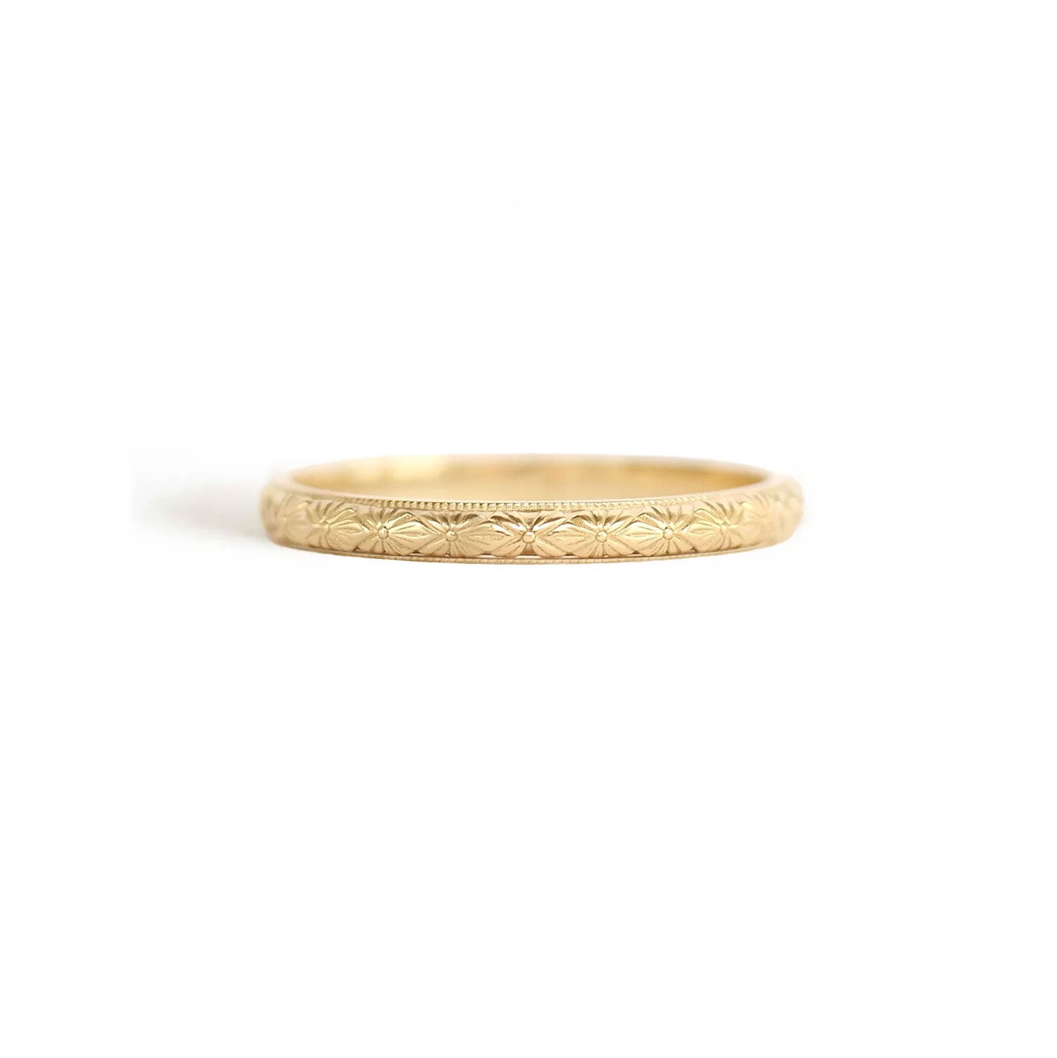 Band Detail: Deco Floral Engraving design goes 3/4 around ring with sizing bar at back.