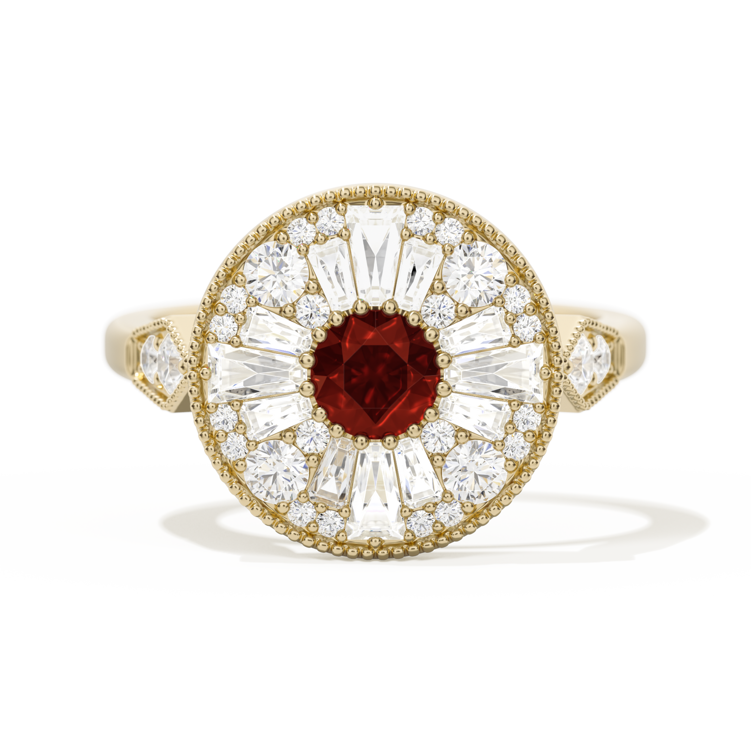 band_style: Antique Shape Diamond Sides / metal: 14k Yellow Gold / profile: Inline / setting: Round / stone: Natural Ruby / style: Ballerina Round