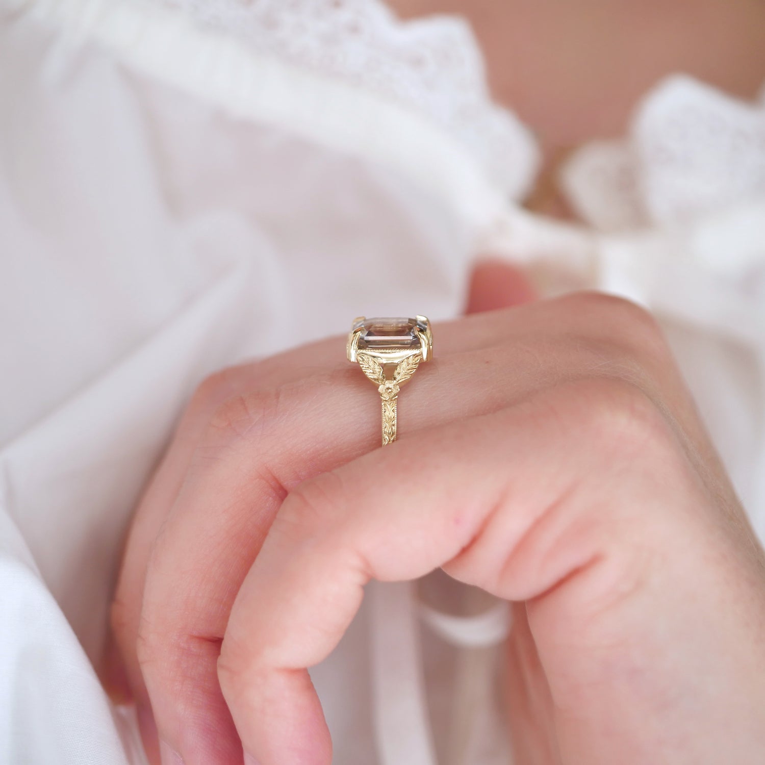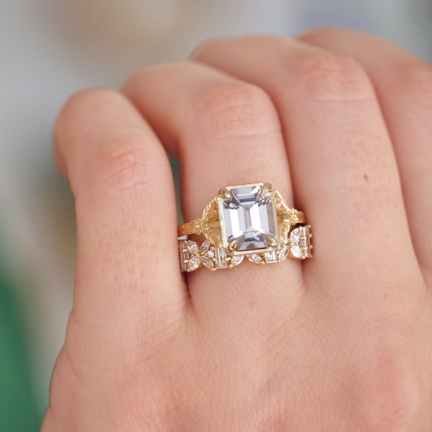 Light Grey Green Sapphire Split Shank Solitaires w/leaves